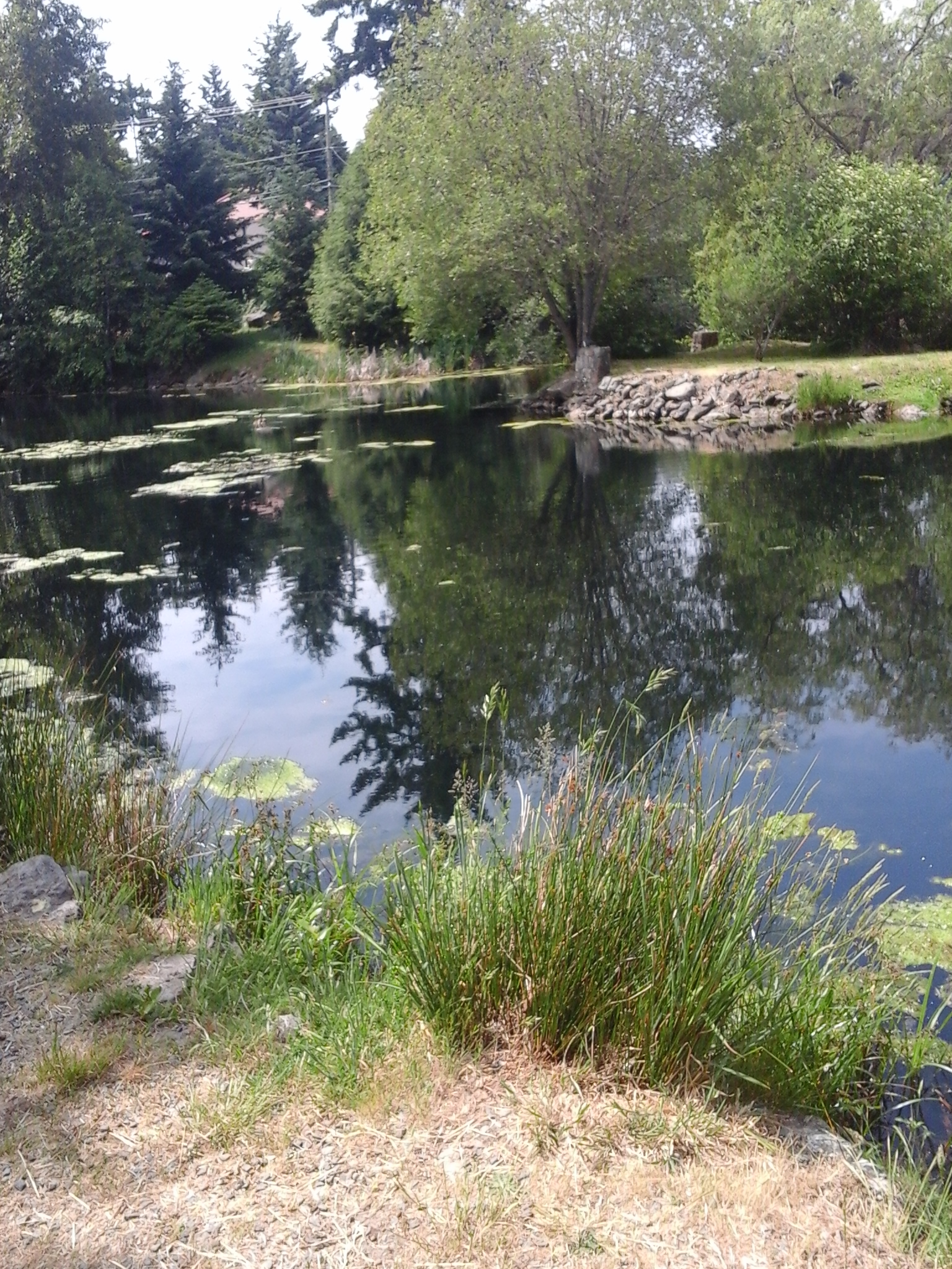 Lake Ida Ann Park is in the Bear Mountain – Florence Lake neighborhood of Langford, B.C. This small manmade lake lies within the Gardner Creek drainage which is part of the Mill Stream watershed. The park is about a hectare in size with a gravel footpath along the shoreline. The four hundred meter pathway is partial forested with alder, ocean spray with small arbutus, willow, cedar and spruce trees. Along the trail, there are picturesque views of the two fountains used to aerating the shallow water. Several benches and picnic tables are found along the lake shore although this is not a lake for swimming as it rather shallow. A wooden pedestrian bridge passes over a seasonal creek near the trail to Jamie Place. The east end of the lake is dammed by concrete bags and a culvert to maintain the water level. This lake is stock annually with seventy-five trout by the government’s environment branch. The expectation is that the fish will be hooked by young novice fishers. Pathways from both Jamie Place and Ashley Place connect to the lake trail. A pleasant two kilometer stroll is around Lake Ida Ann to the trail through Ashley Green Space, north along Millstream Road to Sparrow Green Space and back along the streets in this quiet neighborhood to reach the trail at Jamie Place. Lakewood Elementary School Green Space, Setchfield Park and Camli Green Space are nearby.